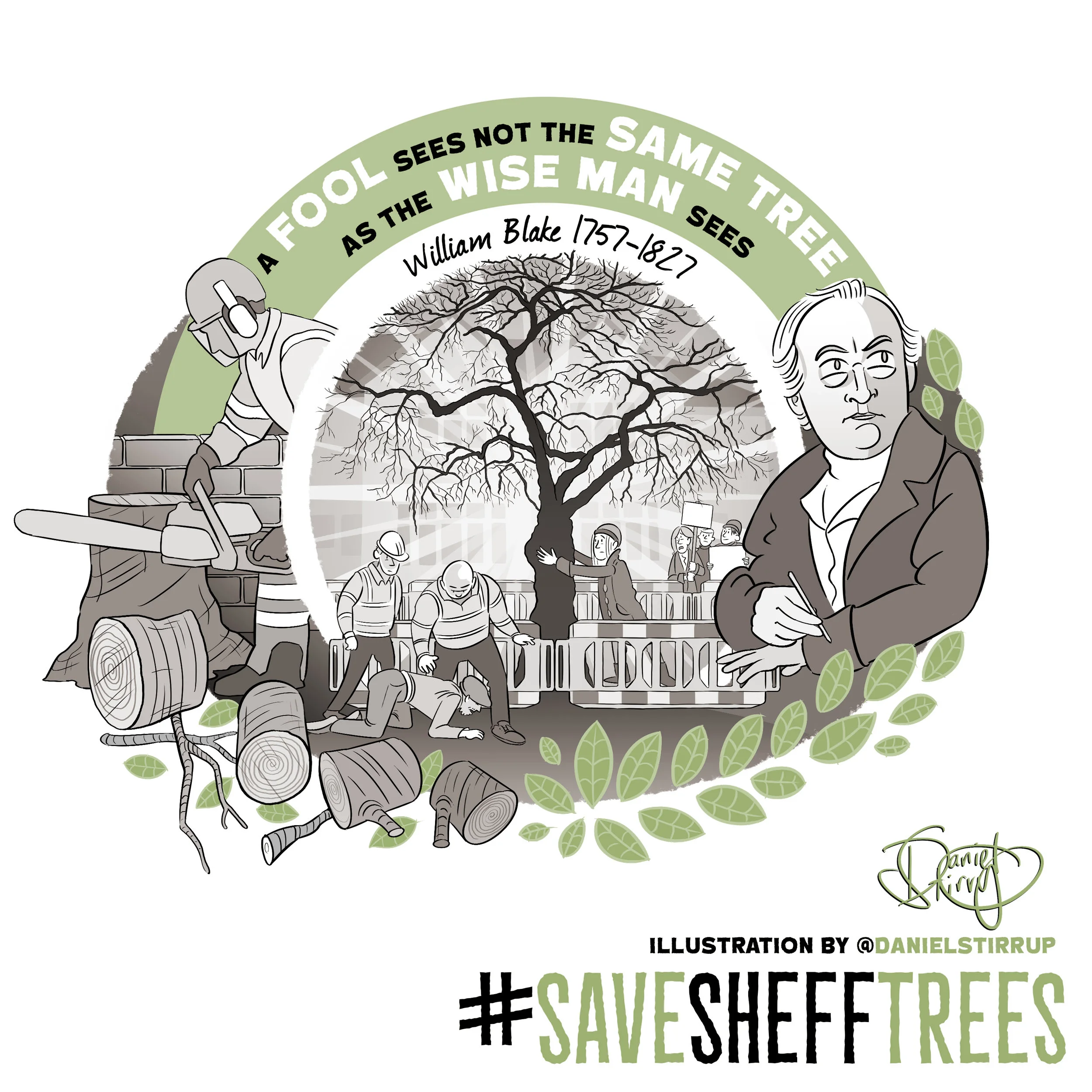 Though I have never visited Sheffield, I became aware through news coverage and social media of the controversial contract between the local council and Amey PLC, which has resulted in thousands of mature trees being felled against the wishes of many residents. This struck me as a senseless act of corporate vandalism in the name or profit, so I created this image in support of the tireless campaigners who have been trying to make the council see sense, and protestors who have done their best to defend the trees that bring so much value and pleasure to our lives. I was touched by the many warm and kind responses to this piece, which was shared extensively on Twitter.